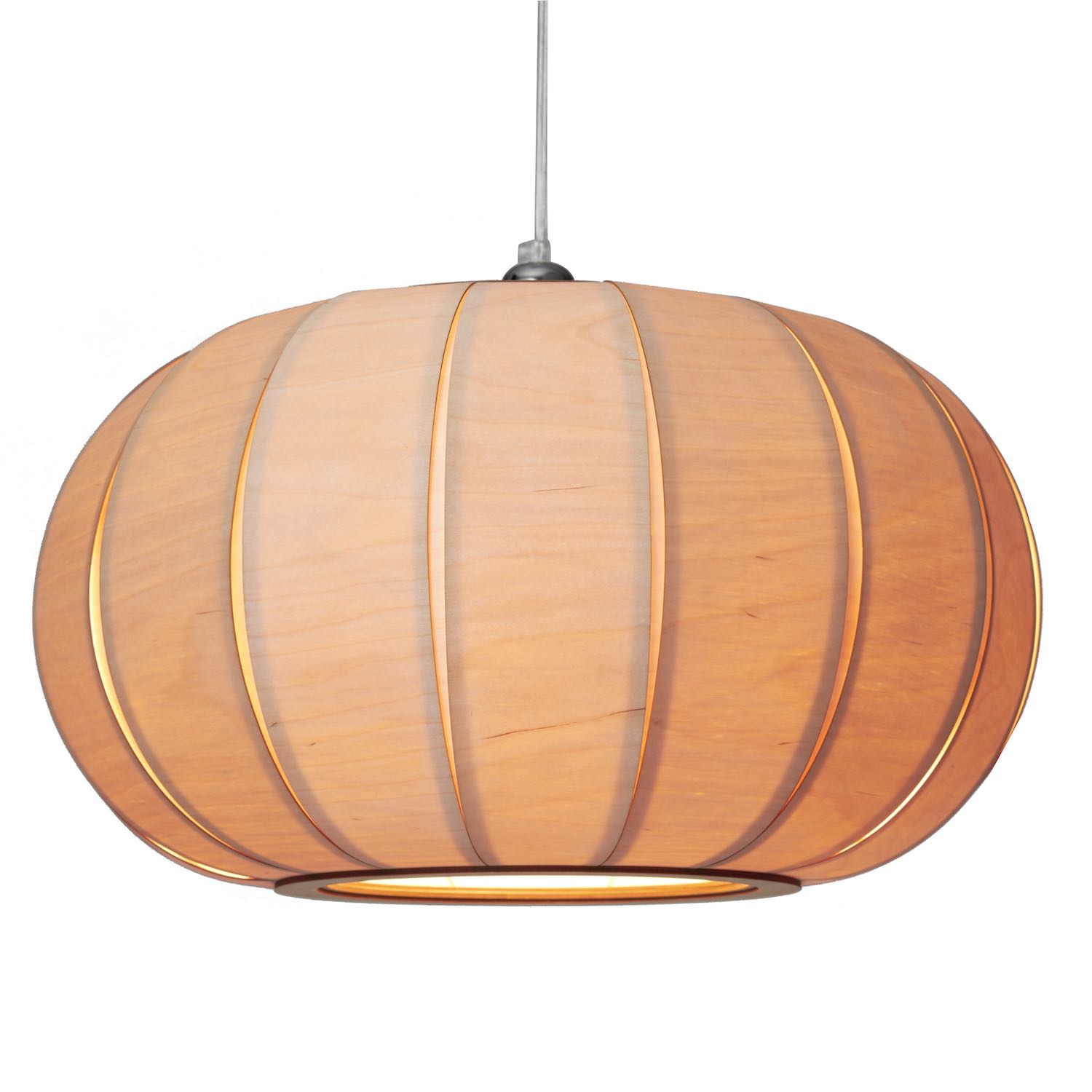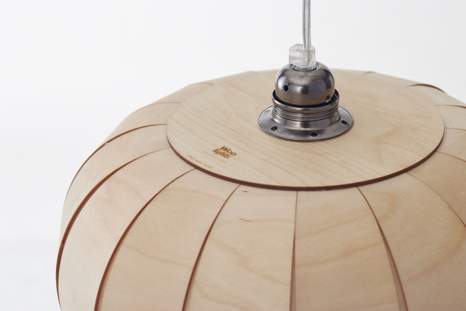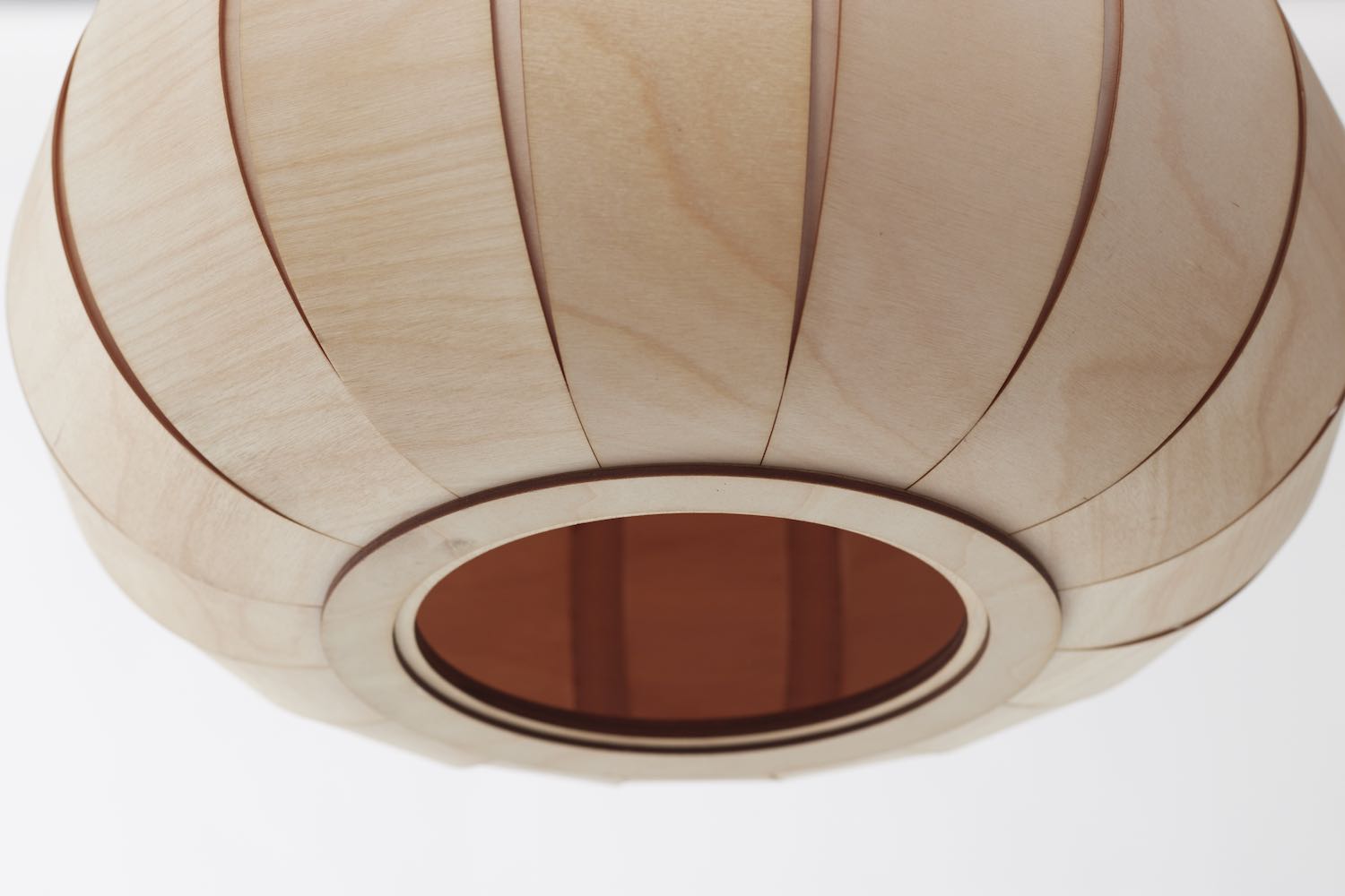 The lamp is made of thin translucent birch stripes. The light closed inside the lamp by wooden petals is diffused and changes colour of the lamp from natural birch wood to orange - yellow, when the light is on. The lamp is opened from the bottom. This hole allows direct light on space beneath the lamp. This is very decorative lamp, ideal as accent light or zone lighting. Perfect to hang above the table in group. Available in two sizes 35 cm and 50 cm in diameter. Digital cutting and lots of hand work is involved in production process of this lamp. Shipped assembled ready to hang on your ceiling.