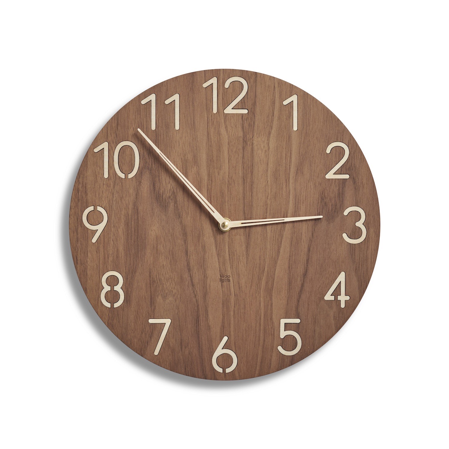 Modern wall clock with large numbers. Striking american walnut-birch wood finish combination. The clock is equipped with high quality precise made in Germany JungHans W 838 clock movement. It will always show you accurate time.
